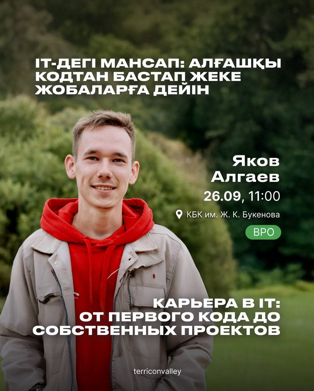 26 сентября в Карагандинском банковском колледже состоится встреча студентов с Яковом Алгаевым, Software engineer freelancer. Лекция пройдёт в формате живого общения, где вместо сухих презентаций будут истории из практики и ответы на вопросы аудитории.